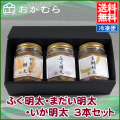 水産の町下関の拘り商品。水揚げされた鮮度の良いふぐ・真鯛・やりいかを辛子明太子で和えた逸品です。ふぐ明太はふぐの女王と言われる真ふぐの身と、とらふぐの皮を明太を和え、真鯛明太は鯛の湯引き刺身を明太で和え、そしてやいりかは細切りした身を明太で和えた逸品です。素材の味を残しつつピリッと辛みの効いた明太和え物をご堪能下さい。